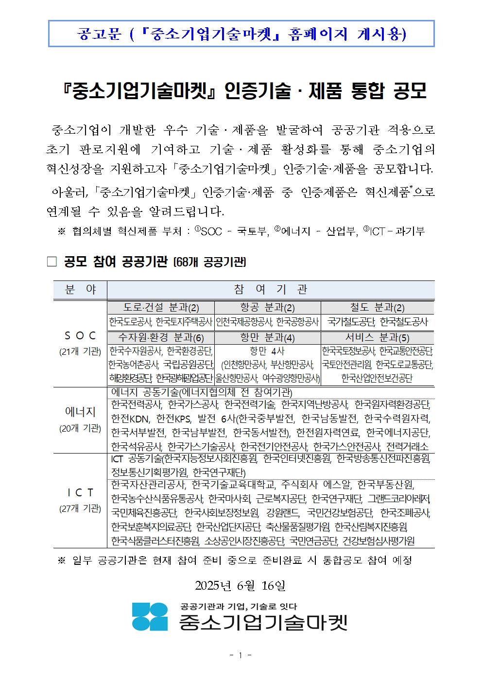 『중소기업기술마켓』 인증기술·제품 통합 공고문.hwpx