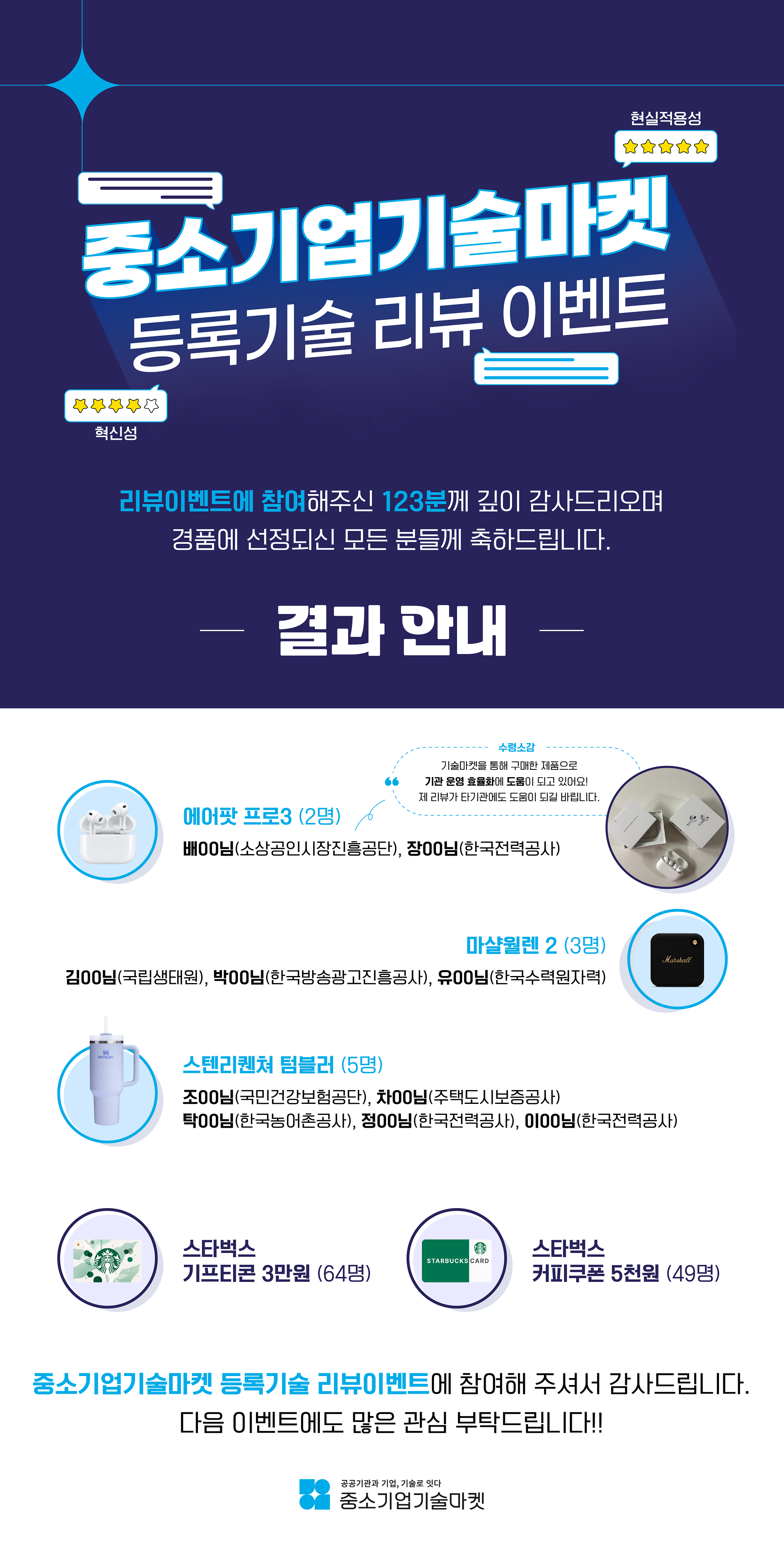 중소기업기술마켓 등록기술 리뷰 이벤트 결과 안내