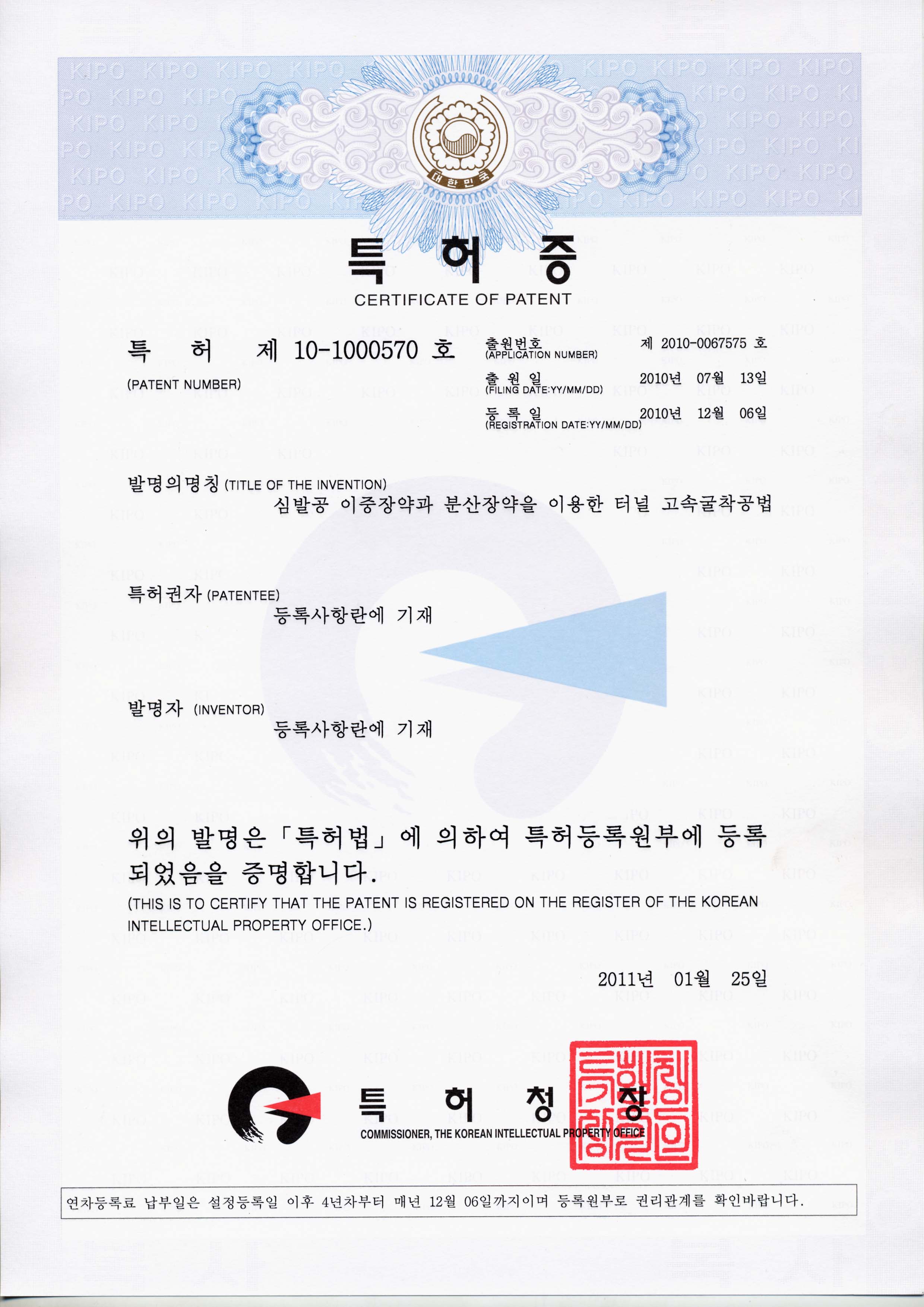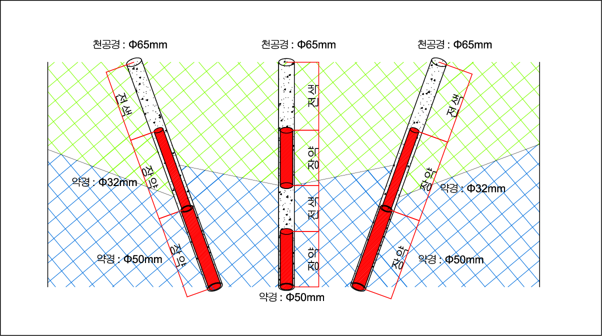 터널 장공발파시 구속력이 크고 자유면 확장이 어려운 심발부에 Φ65mm 구경의 수평공과 경사공의 천공형태를 조합(Power-Cut)한 천공시스템을 적용하고, 암반의 구속력이 큰 수평공과 경사공의 기저부는 Φ50mm폭약, 구속력이 비교적 작은 경사공 주상부는 Φ32m폭약을 장약하여 장약밀도등을 통해 심빼기 영역의 천공과 장약방법을 개선하여 초기자유면의 원활한 확보를 통한 발파굴착효율을 증대 시키고 설계굴착선 최외곽공저부에 파워에어덱(원통형지관)을 넣어 발파시 원지반 손상방지 및 여굴발생을 최소화 하는 공법