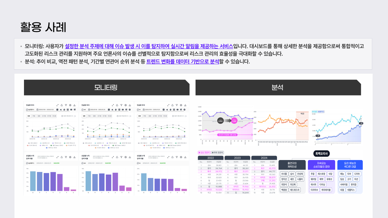 소셜미디어, 뉴스 및 정형데이터의 수집, 저장, 분석 및 시각화 과정을 통해 모니터링, 이슈 탐지가 가능합니다. 문맥 부여, 패턴 분석, 분류 기반 필터링, TPO 분석, 지수 개발, 마케팅 도구 등 다양한 분석 기능을 지원합니다. 고객별로 커스터마이징할 수 있는 대시보드를 제공합니다.