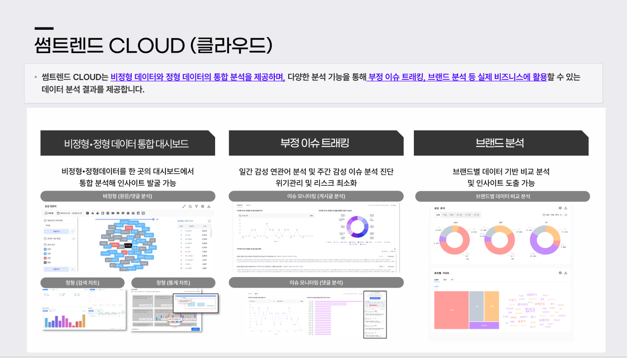 썸트렌드 클라우드는 바이브컴퍼니가 독자적으로 개발한 빅데이터 수집, 분석 관련 GS인증 1등급 솔루션을 활용하여 초대용량 빅데이터를 수 초 내에 분석할 수 있는 빅데이터 분석 서비스입니다.