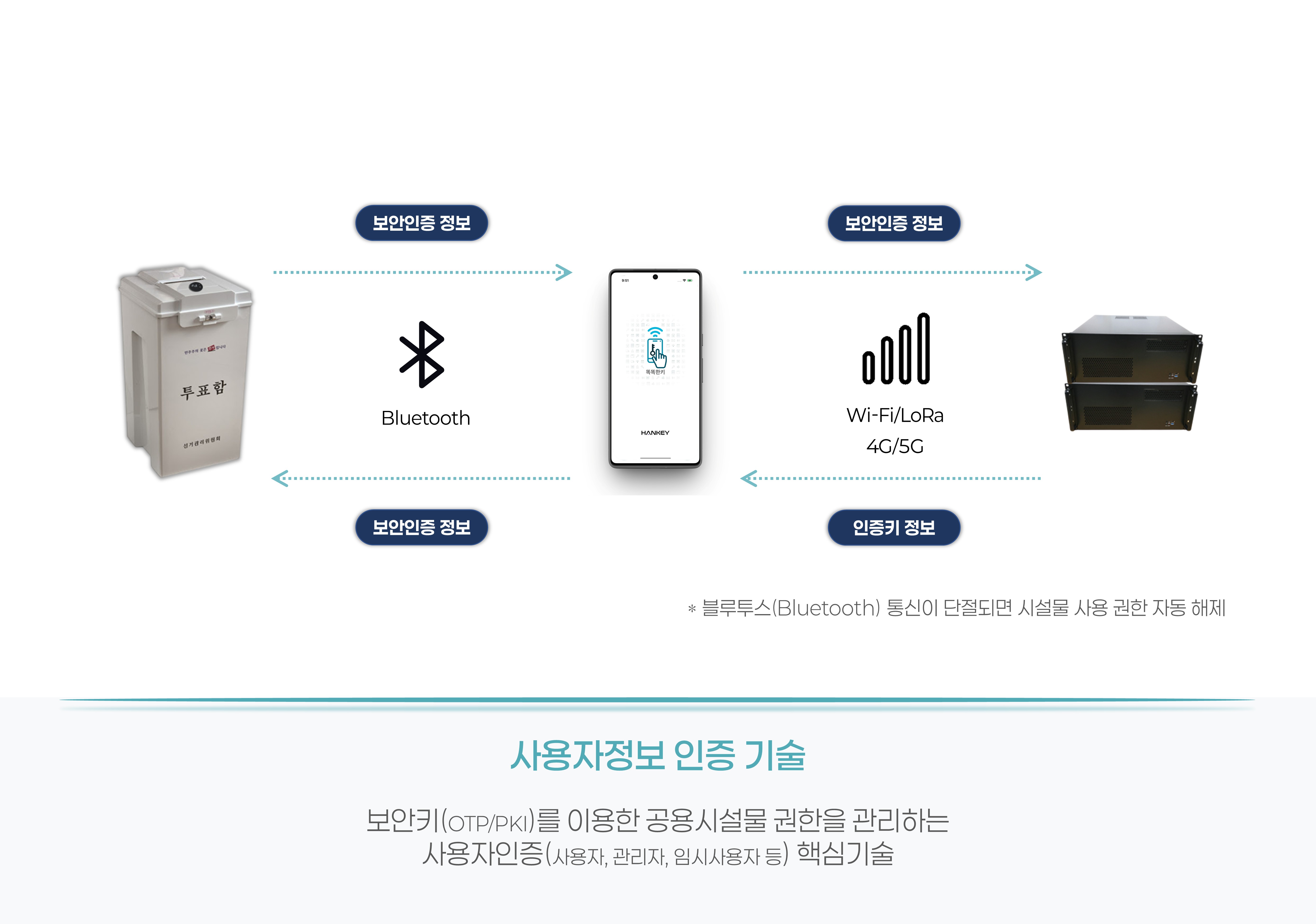 IoT스마트도어락(EPISLOCK, OTP생성/인증, BLE모듈) ↔ 모바일앱(HANKEY) ↔ 인증서버(OTP인증/생성)를 연계하여 안전하고 편리하게 Door를 개폐하는 비접촉방식의 스마트도어락을 적용한 스마트투표함솔루션으로 별도 네트워크망(TCP/IP) 연계 없고, 사용자 개입 없이 자동으로 시설물 사용자인증(보안키, 개인정보보호)과 양방향 OTP(One Time Password) 보안인증을 통해 스마트투표함(IoT스마트도어락)의 도어를 원격 제어하는 시스템