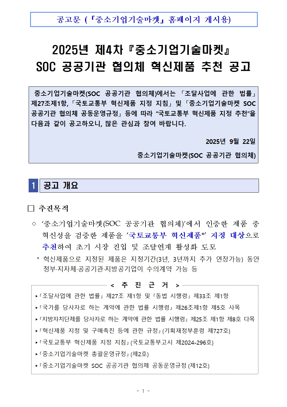 2025년 제4차 중소기업기술마켓(SOC 공공기관 협의체) 혁신제품 추천 공고문.hwp