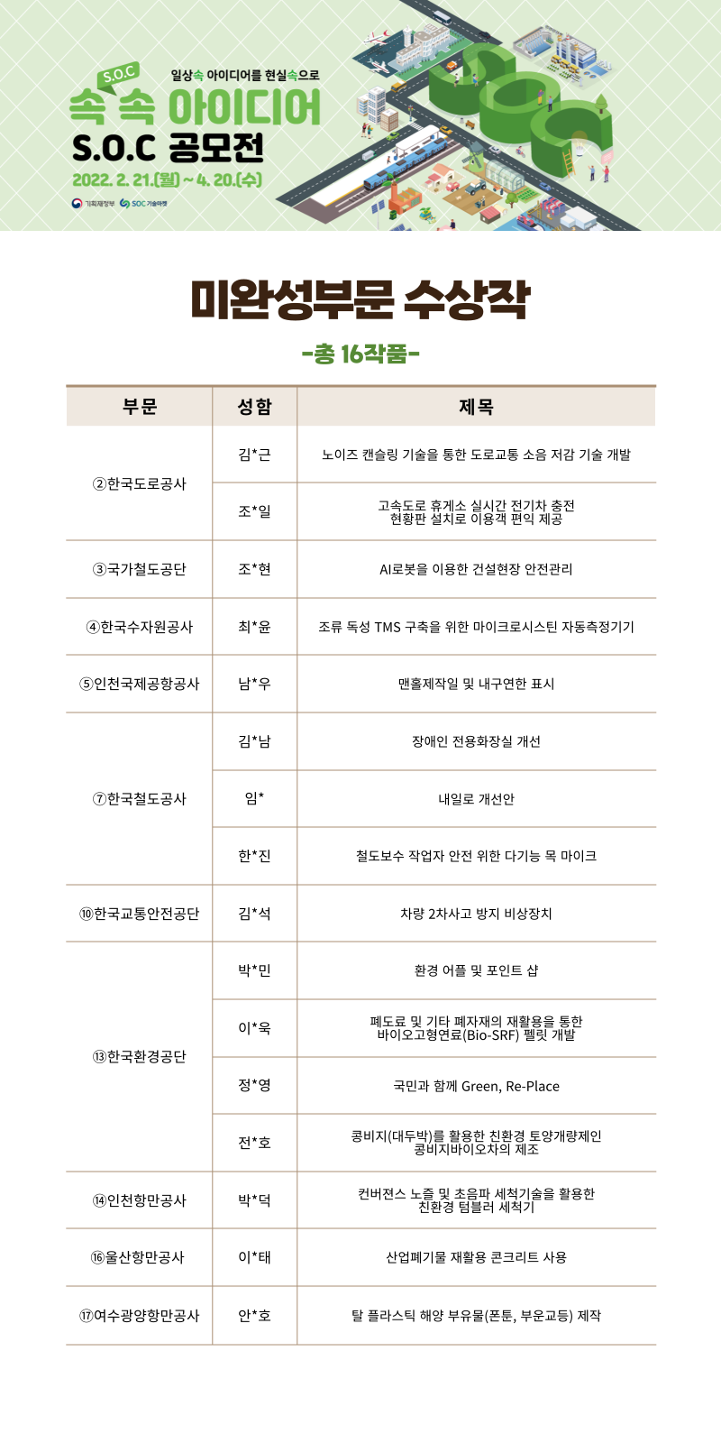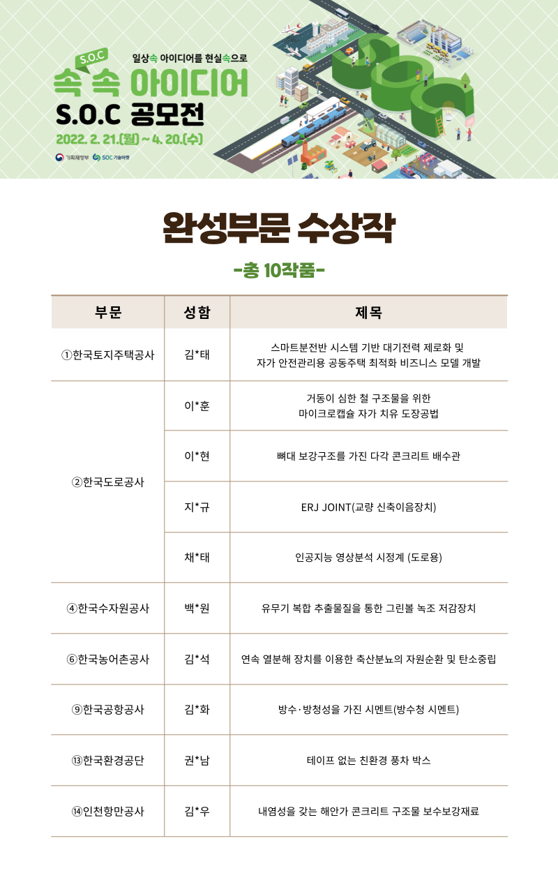 속속 SOC 대국민 아이디어 공모전 최종심사 결과를 알려드립니다.