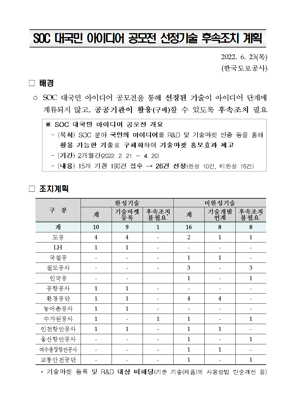 속속 SOC 대국민 아이디어 공모전 후속조치를 알려드립니다.