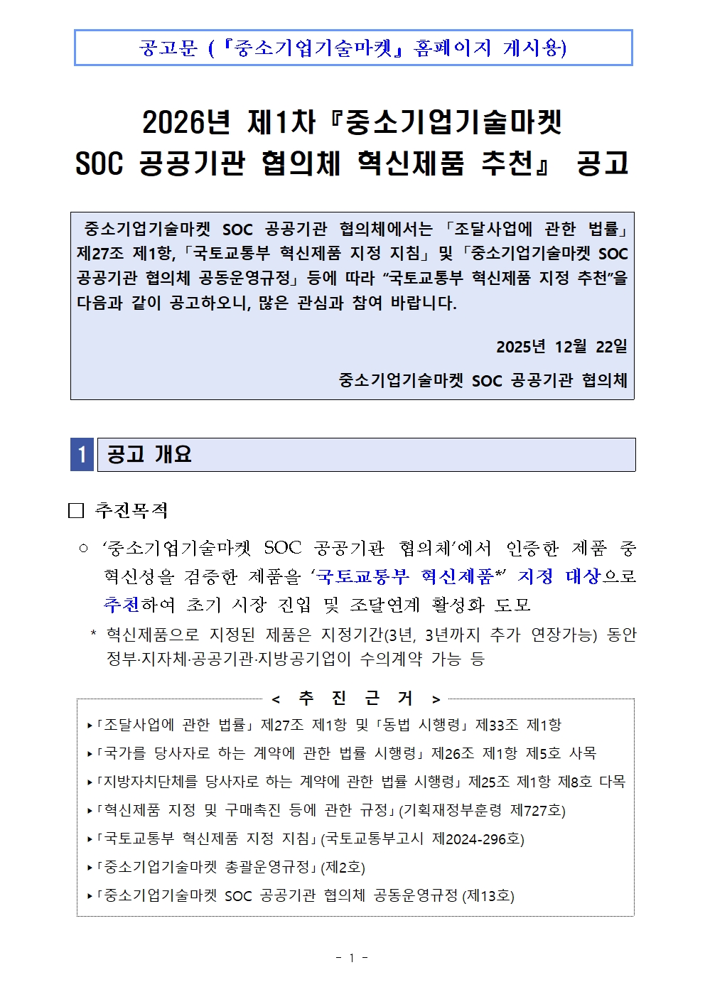 2026년 제1차 중소기업기술마켓(SOC 공공기관 협의체) 혁신제품 추천 공고문.hwp