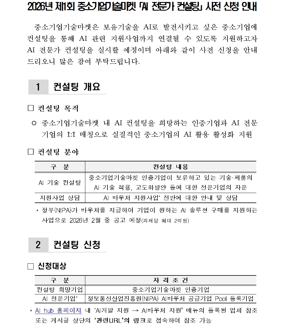 중소기업기술마켓 'AI 전문가 컨설팅' 사전 신청 안내