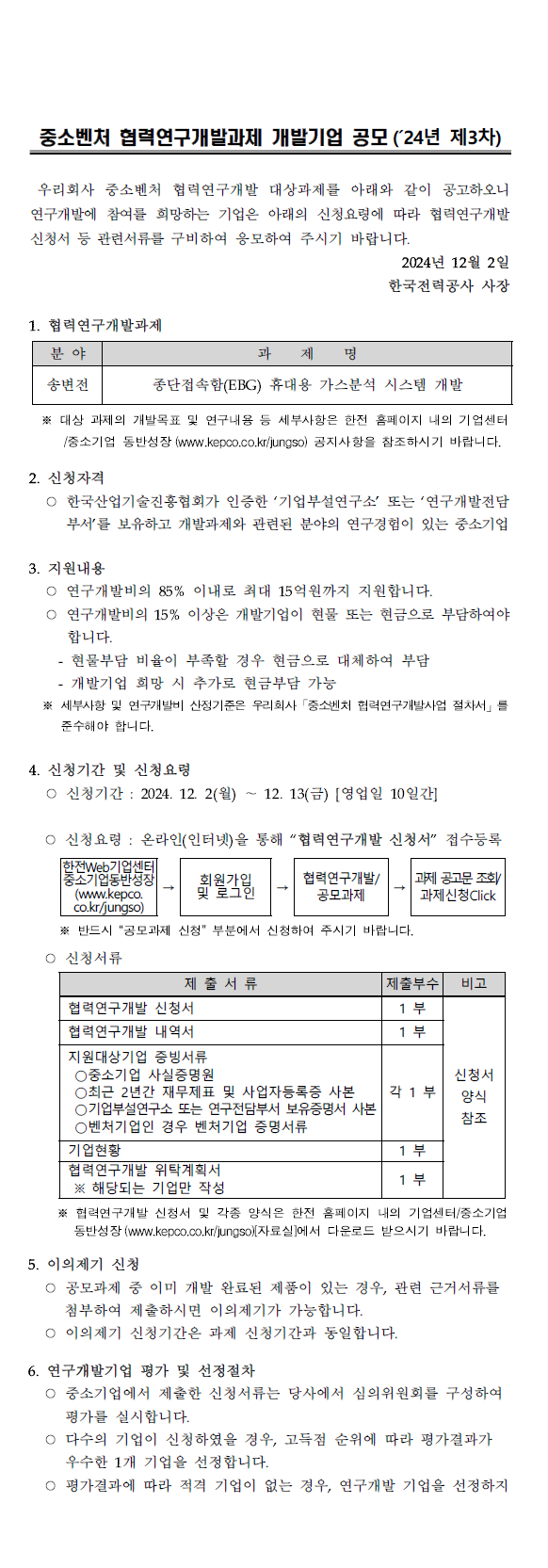 2024년도 제 3차 한국전력공사 중소벤처 협력연구개발 과제 개발기업 공모