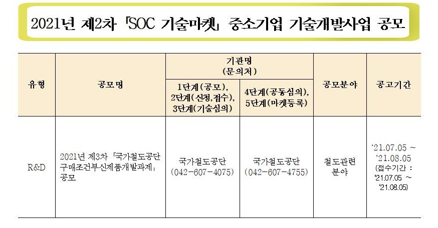 SOC 분야 기술발전 및 중소기업의 혁신성장을 위해 SOC 협의체는 2021년도 제2차 「SOC 기술마켓」 중소기업 기술개발사업 공모를 아래와 같이 통합공고하오니 관심있는 중소기업의 많은 참여 바랍니다.