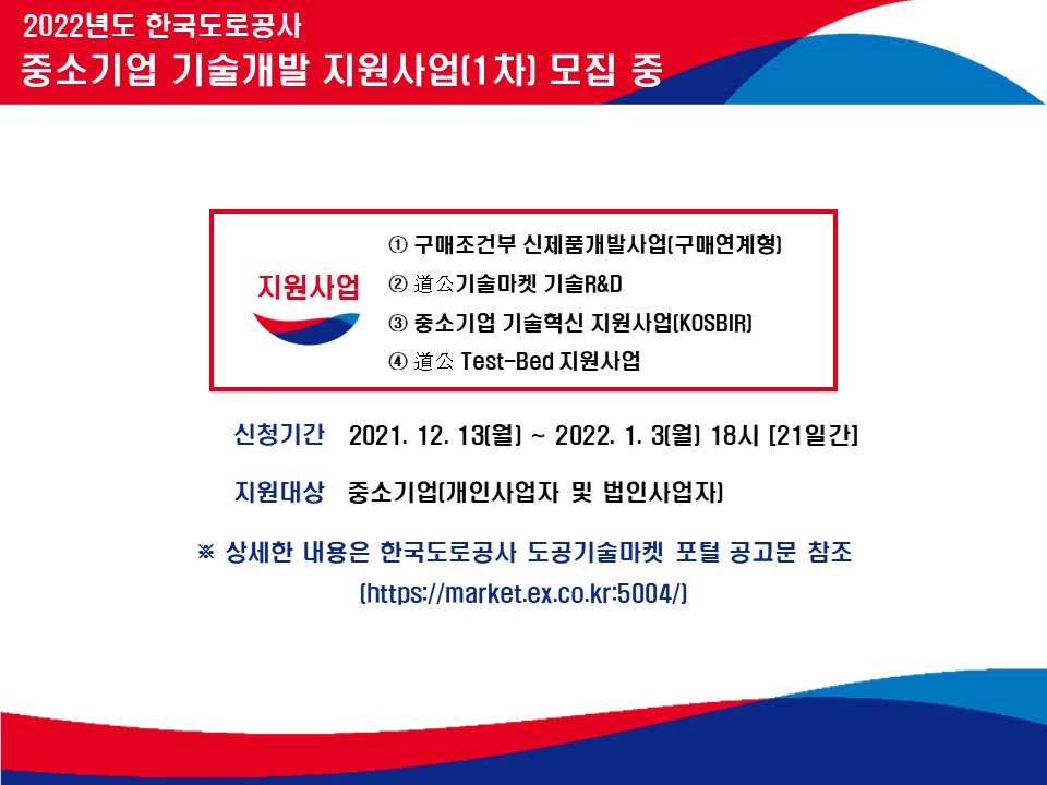 2022년 한국도로공사 『중소기업 기술개발 지원사업(1차)』 통합공고