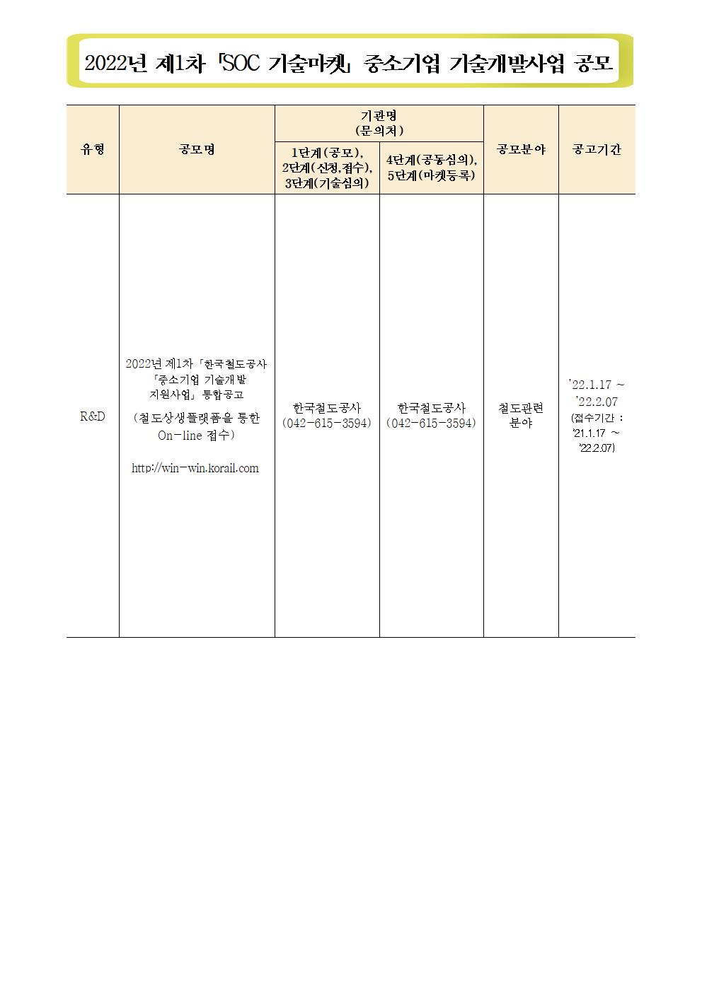 SOC 분야 기술발전 및 중소기업의 혁신성장을 위해 SOC 협의체는 2022년도 1차 「SOC 기술마켓」 중소기업 기술개발사업 공모를 아래와 같이 통합공고하오니 관심있는 중소기업의 많은 참여 바랍니다.