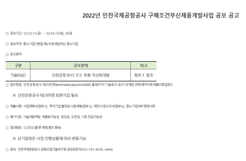 2022년 인천국제공항공사 구매조건부 신제품개발사업 공모를 아래와 같이 시행하오니, 많은 중소기업 여러분의 관심 부탁드립니다.