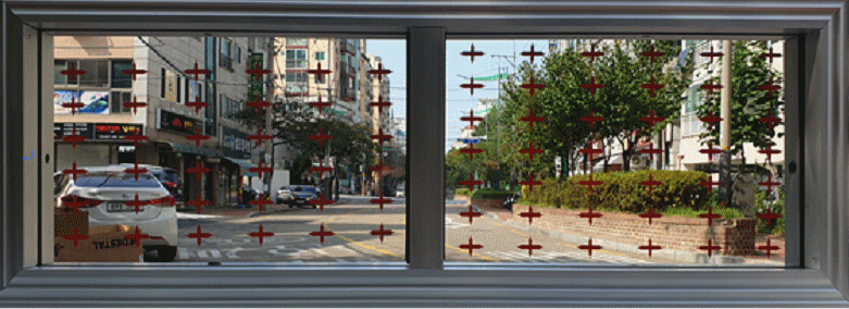 조류충돌방지용 투명방음판은 한쪽 유리면에 유리와 같은성분의 세라믹 실크 스크린 제판 인쇄를 조류충돌방지 법칙의 규격 (4 x 8)에 의하여 입체화 한 문양으로 조류가 잘인식하는 컬러로 도색을 한후 700℃ 고온에서 소성하면 무기질 세라믹 잉크가 용융되어 유리 안에 스며들기 때문에 유리와 일체화 되어 지워 지거나 변색이 없으며 In Glass 제품.
