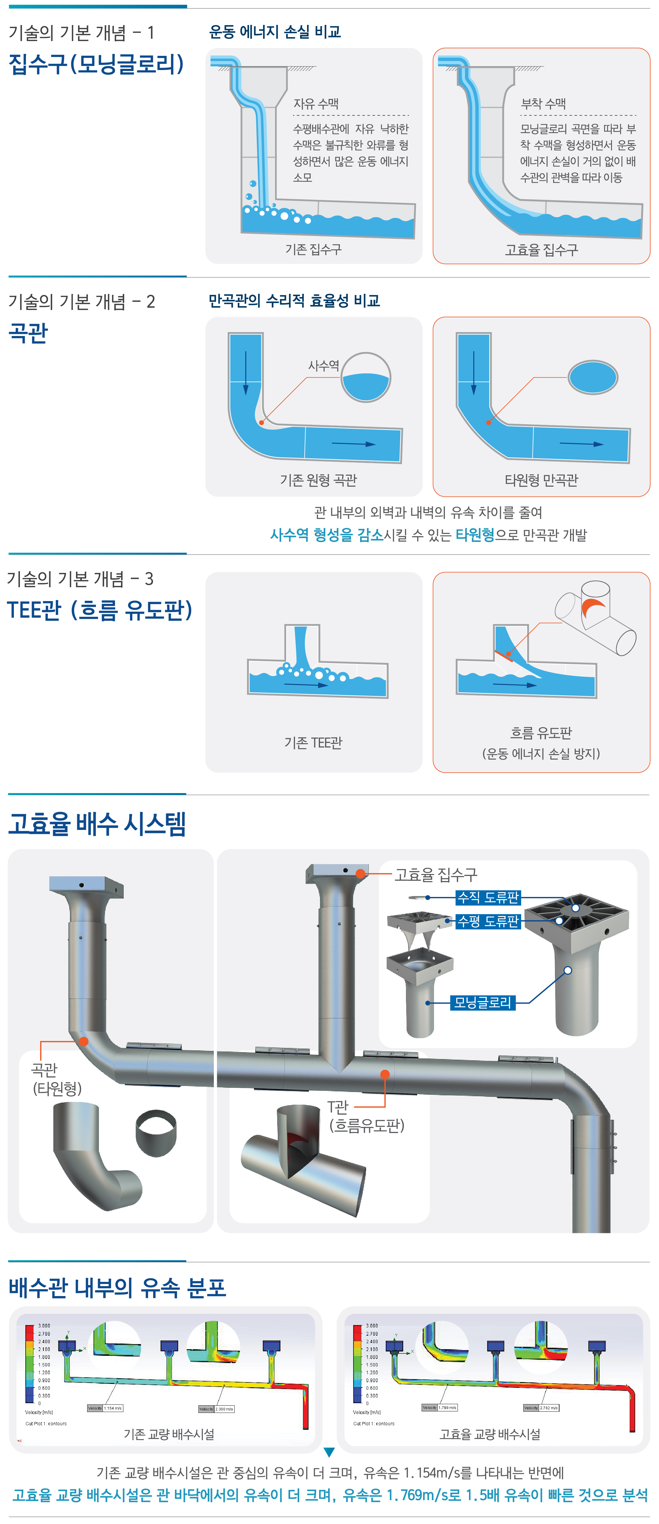 노면 물고임, 배수관 막힘 방지 및 수평배수관 규격을 최소화 하는 기술로서 노면배수는 기존기술 대비 약25%이상 빠른 배수가 가능한 집수구, 배수관내 유속은 기존기술대비 약50%이상 빠르게 계획하여 배수관내 침전물 퇴적방지 , 배수관 시스템 설치에 따른 경제성은 기존기술대비 87%의 경제성을 가지는 신기술