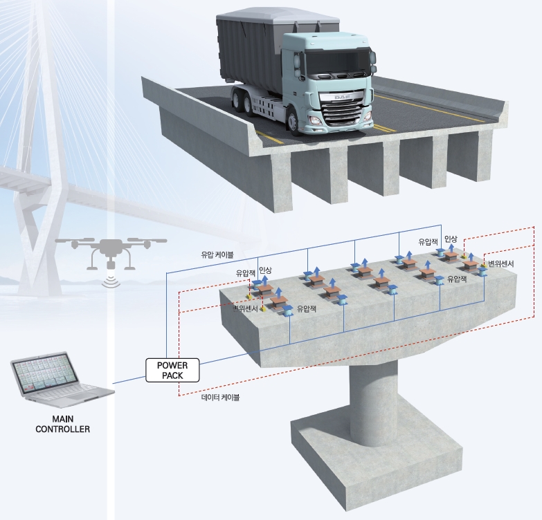 컴퓨터 전자제어 시스템을 통해, 교량 인상 중 변위 및 하중 변화를 실시간 계측, 모니터링 하여 허용오차 1mm 이내의 정밀 제어가 가능한, 안전하고 스마트한 수평 수직 변위제어 인상 시스템
