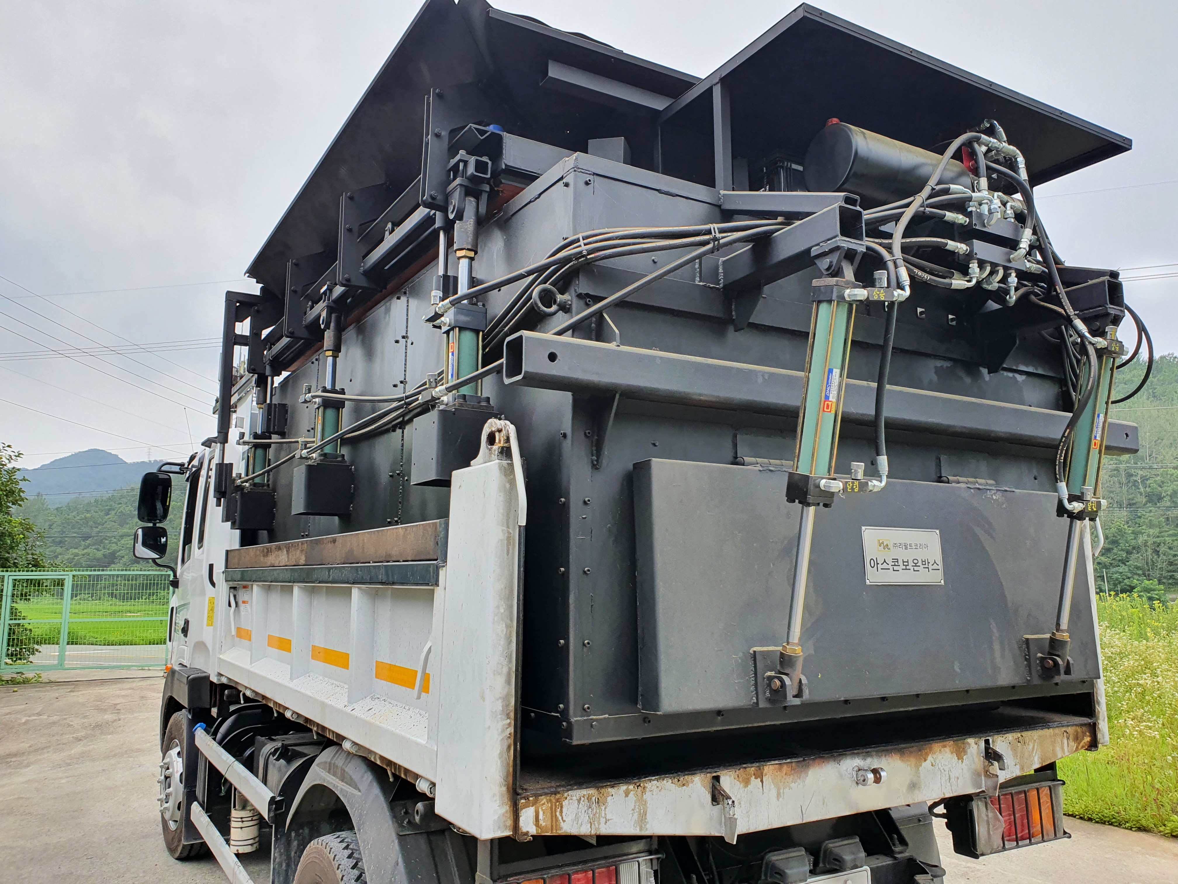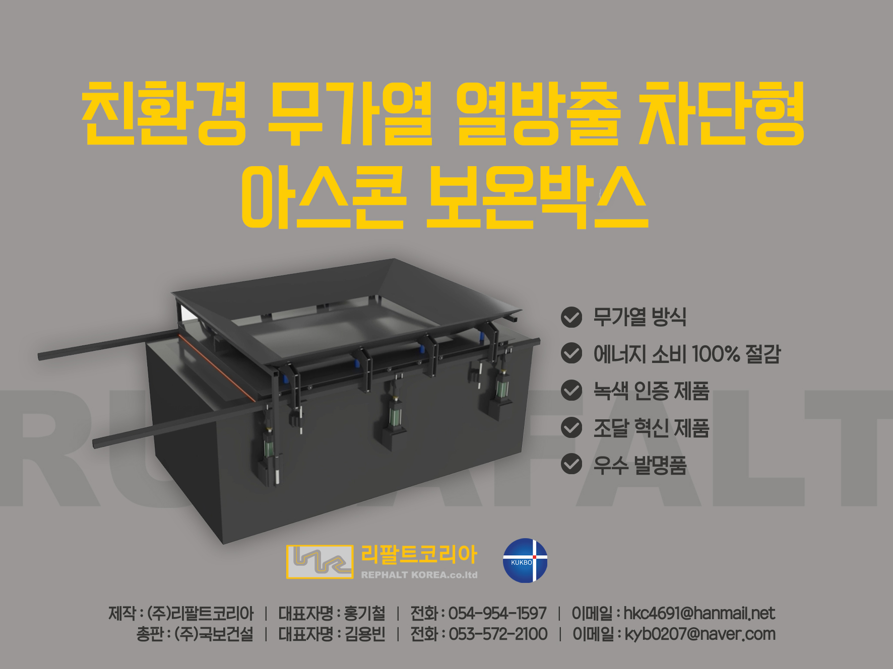 본 기술은 무가열 방식으로 외부의 기온과 이동거리에 상관없이 도로 포장 및 보수 등을 위해 24시간 이상 아스콘을 적정한 온도(120℃~140℃)로 보관·이동이 가능한 “친환경 열방출 차단형 아스콘 보온박스”이다. 별도의 가열 장치가 필요 없어 기존 제품의 문제점이었던 아스콘 탈리 현상과 작업성 저하(온도 저하로 인한 아스콘 폐기물 발생이 없음)가 없으며, 아스콘을 저장 및 장거리 현장 수송이 가능한 제품이다. - 2021년 녹색기술 및 제품 인증, 우수발명품 우선구매추천 선정, - 2022년 조달청 혁신시제품 지정