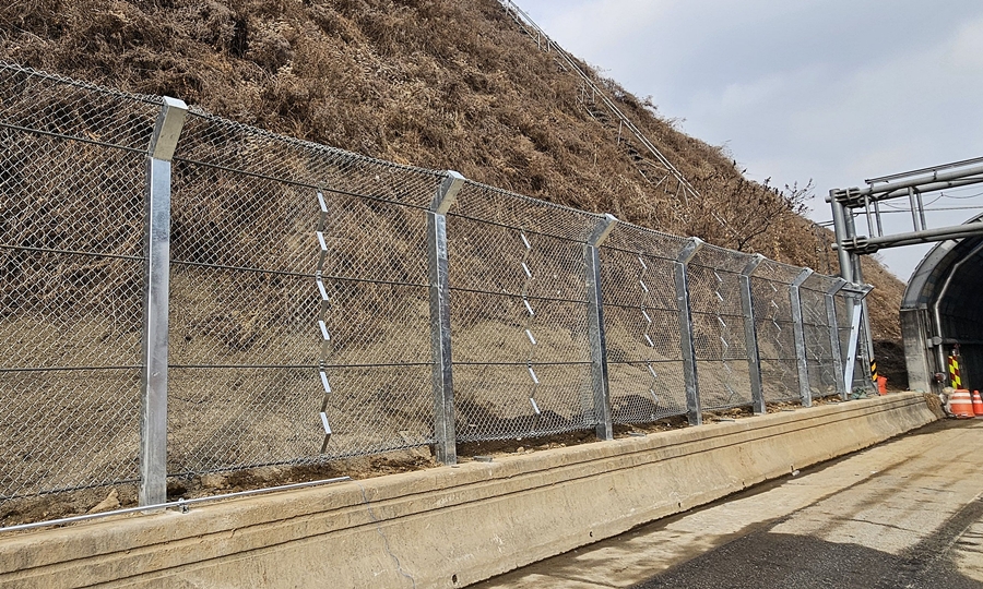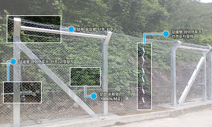 기존 낙석방지울타리의 취약부위를 보완하여 □형강 지주, 상부보강형 □형강 단부지주, 고강도선재 포획망, 감쇄형 와이어로프 간격유지장치, 감쇄형 와이어로프 고정장치 등으로 구성된 방호성능 120kJ급 낙석방지울타리 기술임. 특히, 낙석 자유낙하 120kJ급에 대한 실물성능시험에서 고속도로 갓길의 70% 수준인 1.4m 이내의 변위 검증과 PVC 코팅망 2배 이상인 100kN/m이상의 망장력을 갖는 고강도 강선 포획망에 대한 공인인증시험을 수행함.