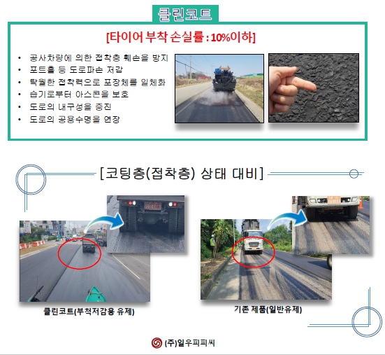 부착방지제가 함유된 접착제(유화아스팔트)로서 프라임코트 및 택코트 용도로 사용되어 도로포장 층을 결합시키고, 건설장비 타이어에 부착되어 훼손되는 현상을 방지하며, 수직 응력과 전단응력을 하부 층으로 원활히 전달하여 도로의 내구성을 증진시키는 제품