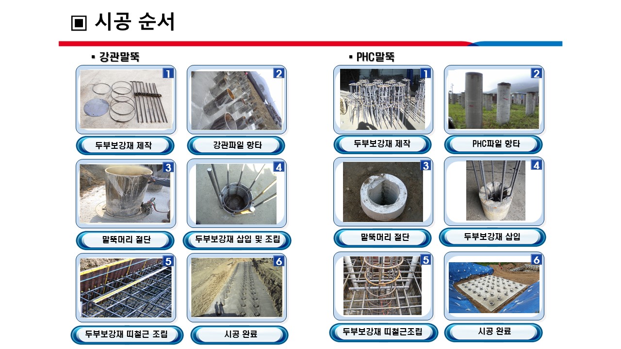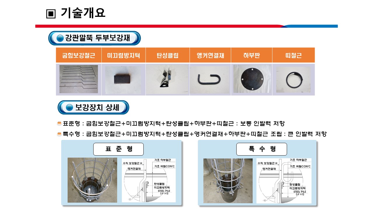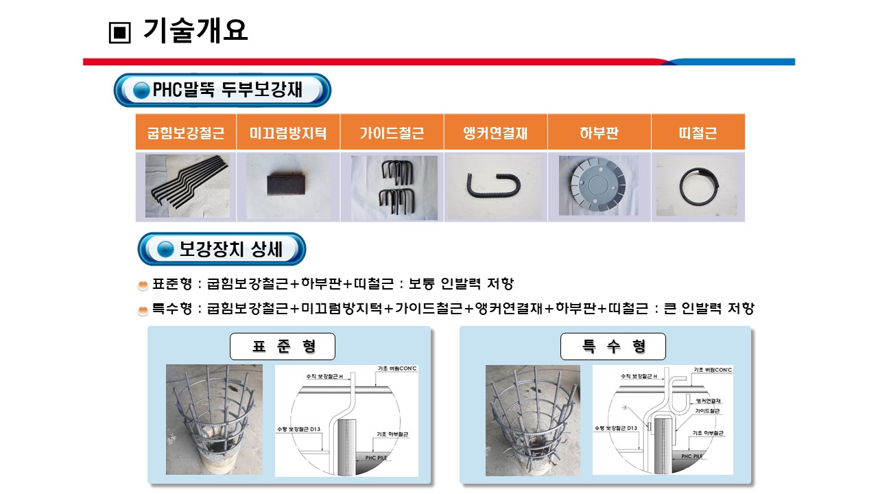■ 공법 개요 o 설계기준 및 기존기술의 문제점을 대폭 개선에 착안하여 개발된 공법으로서, 동등한 말뚝머리 보강장치를 이용하여 강관말뚝 및 PHC말뚝 등의 모든 말뚝머리 보강에 적용되는 다용도 공법과 압축력, 인발력, 전단력 및 휨모멘트에 대해 철근량을 줄여 경제적이면서 효과적으로 저항하도록 하는 것과 동시에 설계기준에서 요구하는 힘의 전달 및 저항 메카니즘보다도 더욱 향상시키는 것과 보강장치를 소수 인력에 의해 삽입과 걸침으로서 조립이 간단하게 이루어지는 것을 주요 목표로 하여 개발된 기술