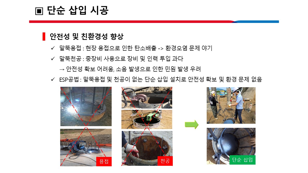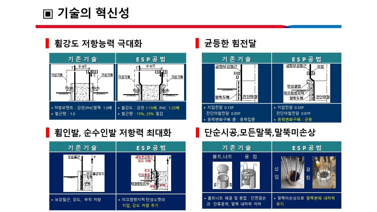 ■ 공법 특징 o 굽힘보강철근의 모멘트팔길이 증대로 보강철근량 15%~25%감소 o 굽힘보강철근․미끄럼방지턱부착탄성소캣과 앵커연결재 등 단위모듈러장치와 덮개판를 단순 삽입 조립 o 장비와 인력 소요 최소 o 단순삽입 설치방식으로 말뚝에 볼트홀천공, 용접에 의한 잔류응력이 없어 말뚝 내하력 불변 o 천공이나 용접, 볼트너트 체결 장비가 없고 자재 경량에 의한 유류 등 에너지 및 탄소배출량 절감 o 경제성, 구조안전성, 시공성 및 에너지 절감 측면 등이 기존기술에 비해 탁월하여 토목공사와 건축공사에서 활용성이 넓음. o 강관(복합) 및 PHC파일 등 모든 파일에 적용가능