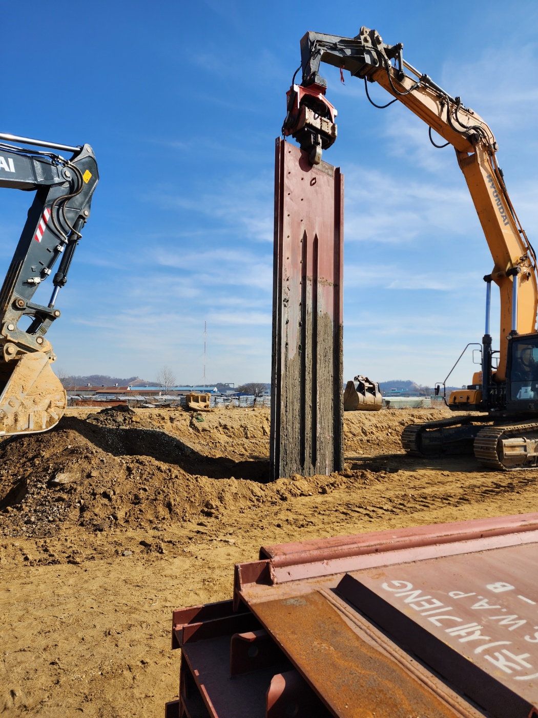 3. 일패형 패널 항타와 1단 2단 3단 터파기 동시시공 및 접이식 버팀대 동시 시공으로 1개의 패널마다 구조체 완성으로 전공정을 동시 병행 시공 가능하고, 민원발생구간 당일 굴착 당일 복구 가능 , 2단 터파기 장비 가시설 구간내 투입 불필요, 터파기 폭 최소화 시공 가능.