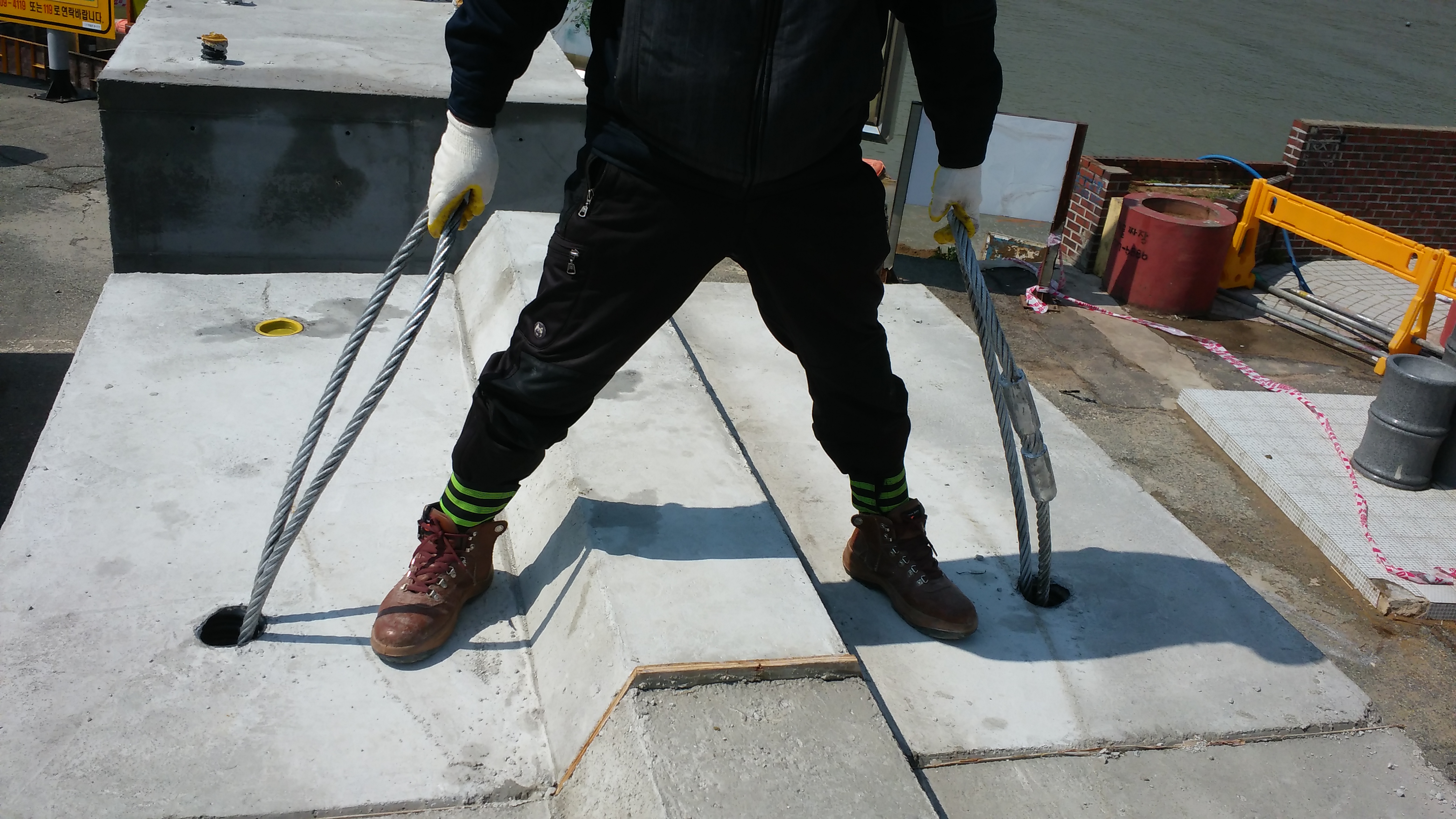 와이어로프를 재사용할 수 있도록 개발된 항만용 콘크리트 무들고리블록 제작 및 설치공법이다