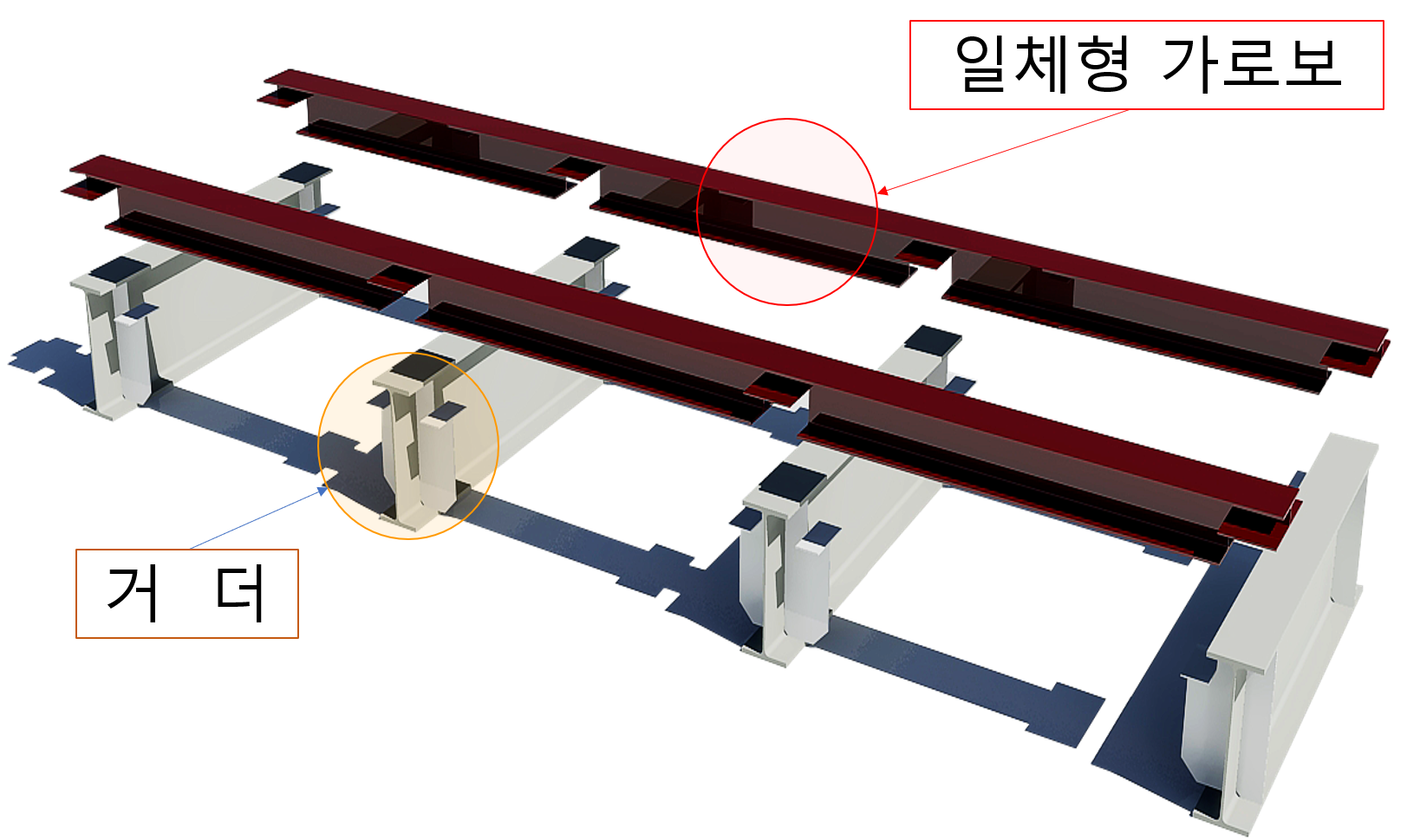 거더에 프리스트레스 도입등의 별도 공정이 없으며, 거더 상부에 연속화된 일체형 가로보 조립체를 설치하고, 가로보 상단에 복공판을 교축방향으로 배치하여 차량하중의 재하수를 최소화시켜 복공판의 파손율을 최소화 및 소음 진동을 감소시키며 가로보를 통해 하중을 횡방향으로 분산시켜 거더 및 파일 수량을 감소하는 공법