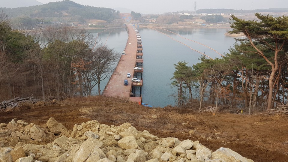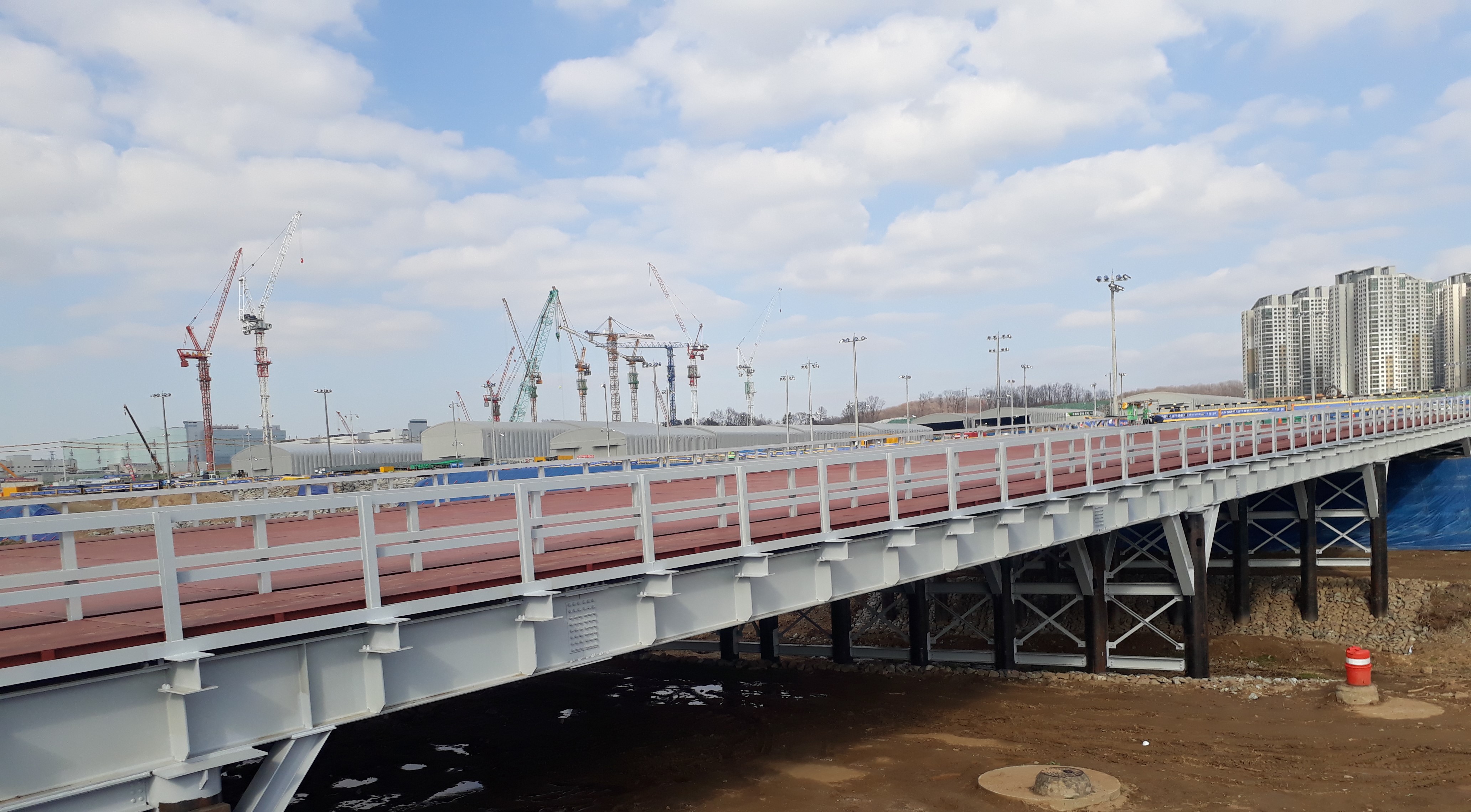 ◆시공성 - 일체형 가로보의 시공으로 장비사용기간 감소 및 공기단축 - 거더간 연결부 설치 용이(용접이 아닌 볼트 연결) - 상재하중에 따라서 자유로운 거더의 배치간격(2.0~4.0m)으로 경간장과 폭원을 현장 여건에 따라 적용 가능 - 거더(열)과 파일(열)수의 감소로 공사기간 최대로 단축