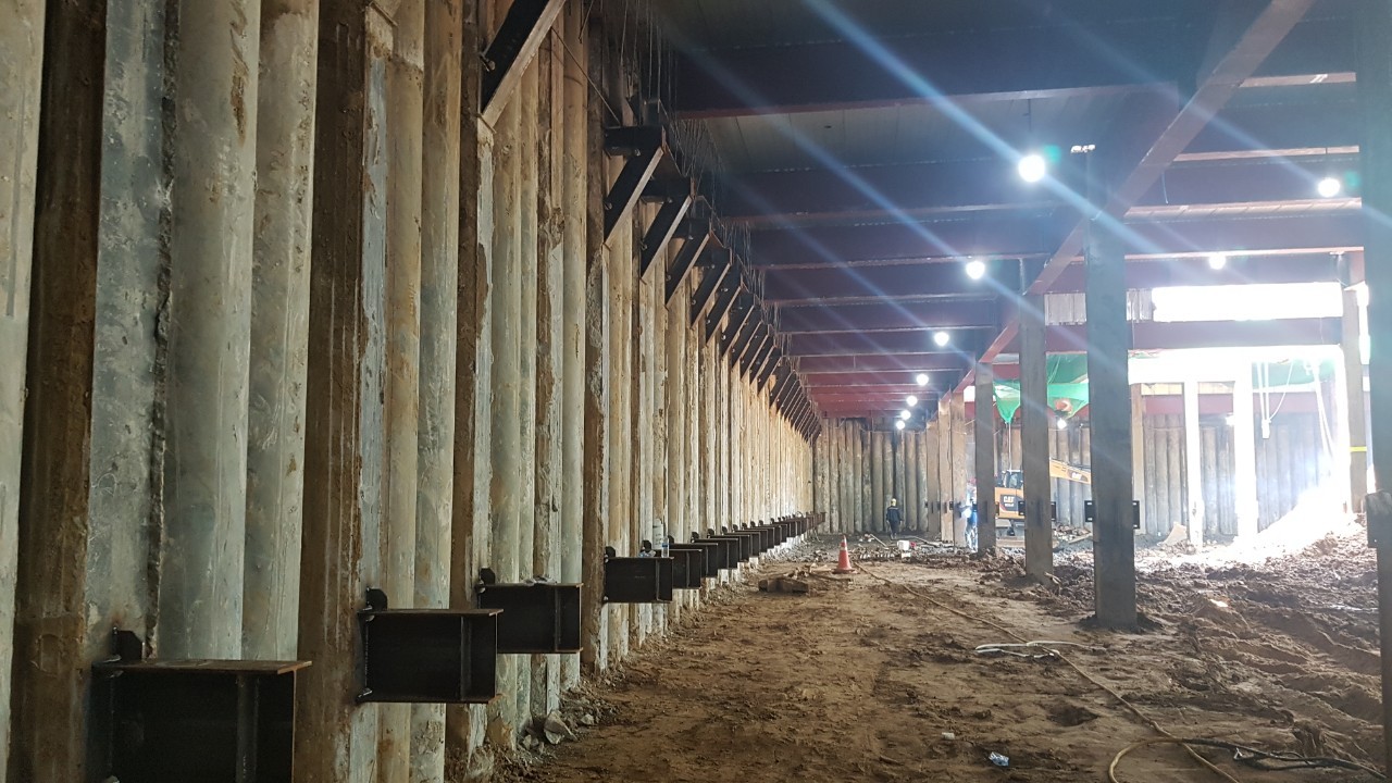 - H-PILE 매입 엄지말뚝은 현장타설 말뚝으로 시공하고 철근망 매입 CIP 말뚝은 PHC PILE로 대체하여 기성말뚝을 혼합 사용하는 공법임.