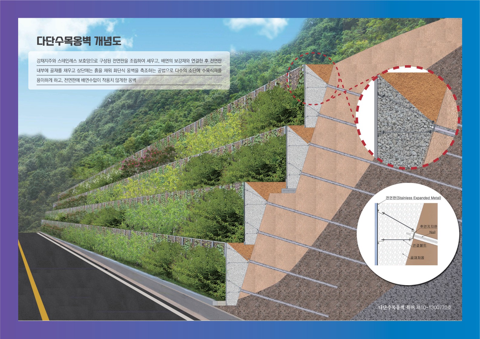 ∙ 원지반의 깎기를 최소화하고 하부지반에 작용하는 하중을 경감시키는 최적화된 십자형상의 경량패널과 경사각 조절이 가능한 영구앵커를 이용하여 비탈면의 안정성을 확보하는 공법