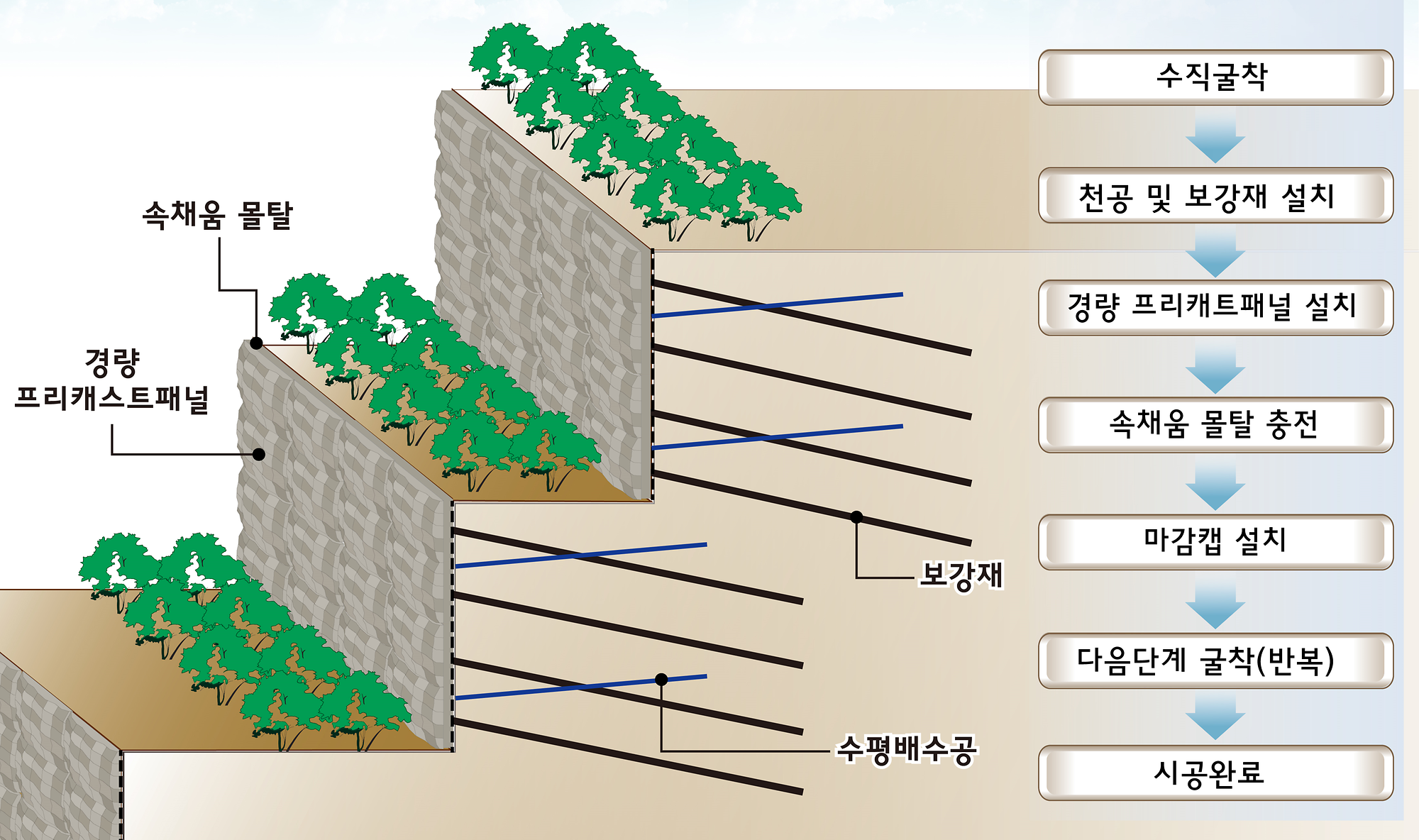 - 띠장 설치, 별도 앵커체 불필요한 단순 공정이며 가볍고 취급이 용이한 토목섬유 사용으로 해체 시