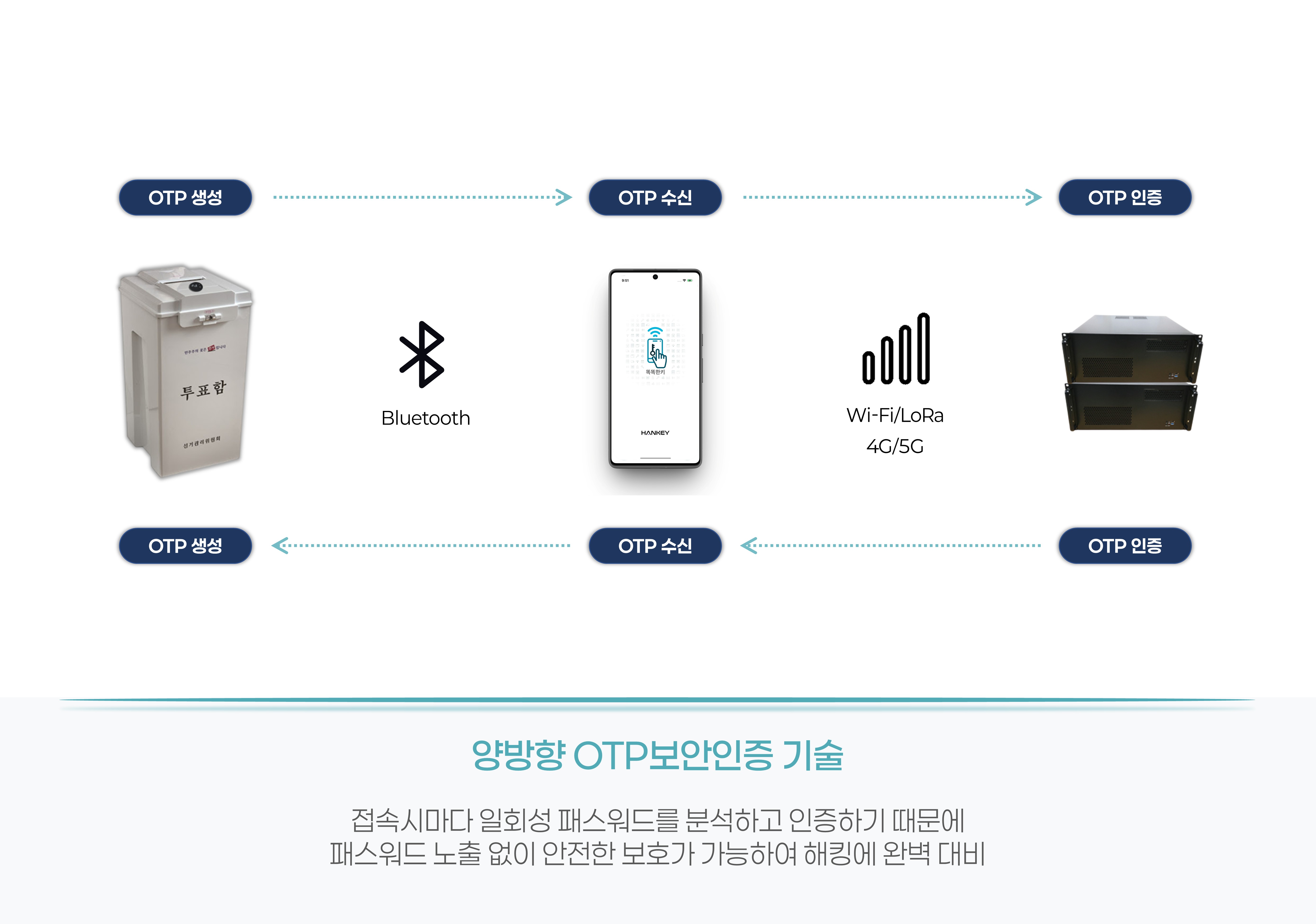 IoT스마트도어락(EPISLOCK, OTP생성/인증, BLE모듈) ↔ 모바일앱(HANKEY) ↔ 인증서버(OTP인증/생성)를 연계하여 안전하고 편리하게 Door를 개폐하는 비접촉방식의 스마트도어락을 적용한 스마트투표함솔루션으로 별도 네트워크망(TCP/IP) 연계 없고, 사용자 개입 없이 자동으로 시설물 사용자인증(보안키, 개인정보보호)과 양방향 OTP(One Time Password) 보안인증을 통해 스마트투표함(IoT스마트도어락)의 도어를 원격 제어하는 시스템
