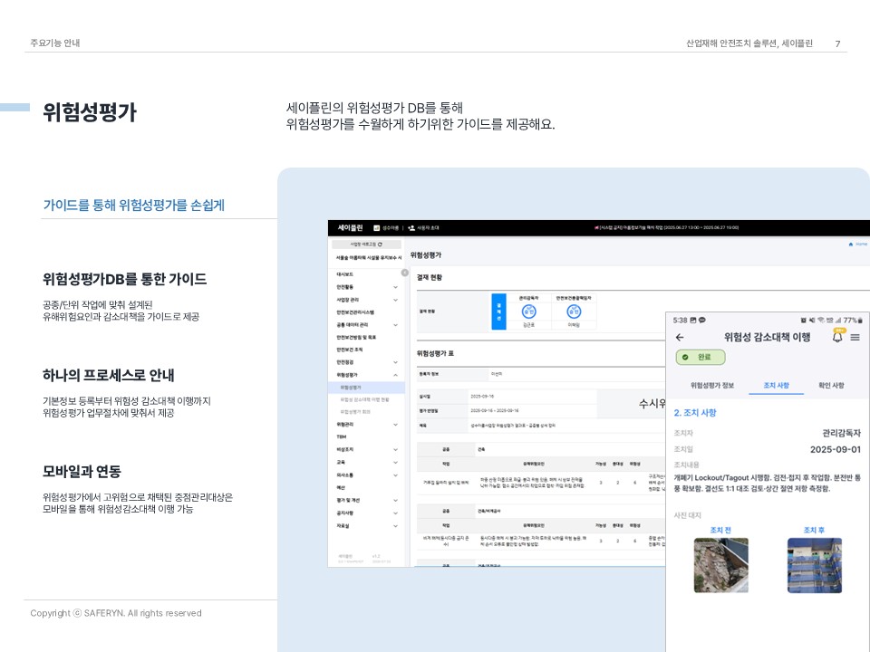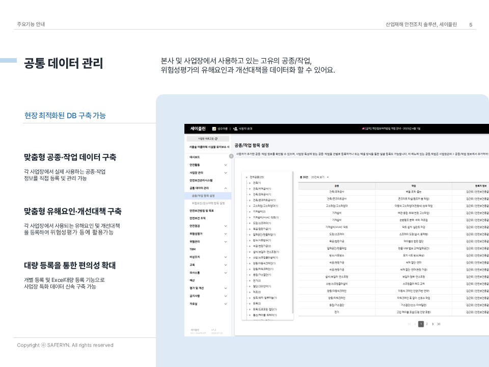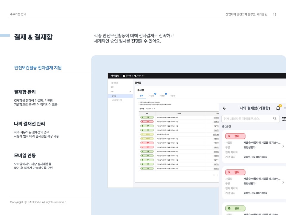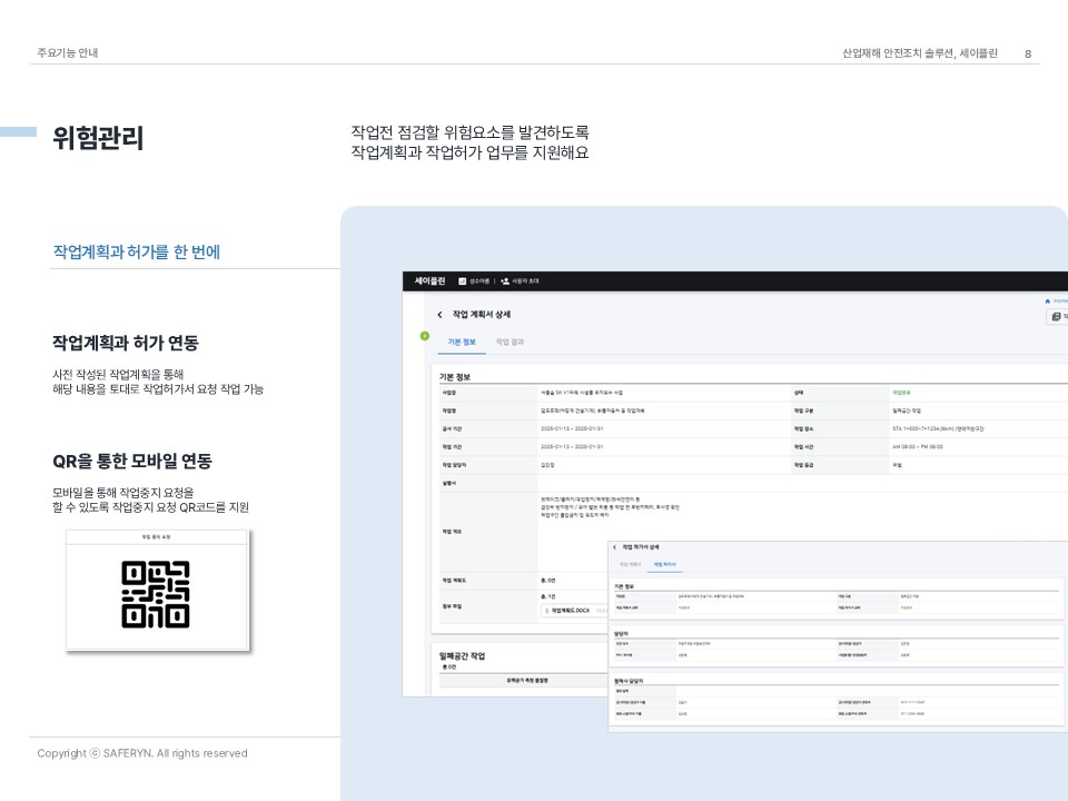 - 위험관리: 근로자의 작업중지요청에 대한 대응이나 작업계획서/작업허가서에 업무사항 관리.