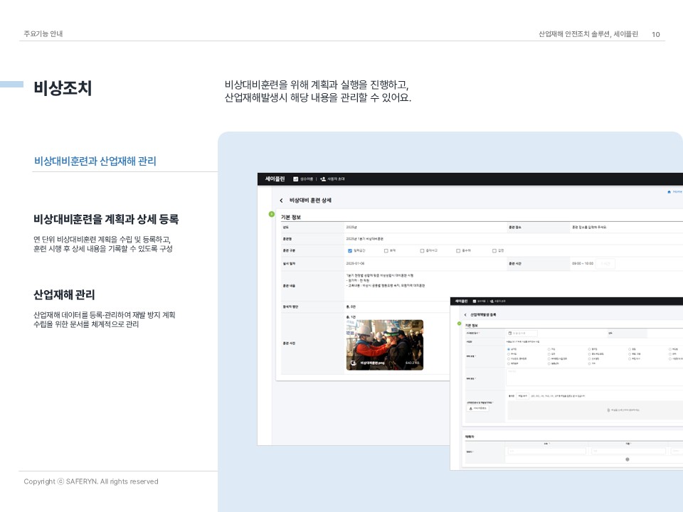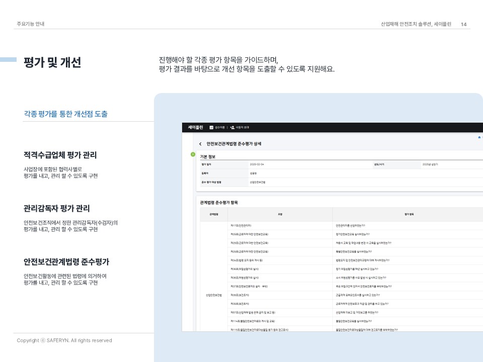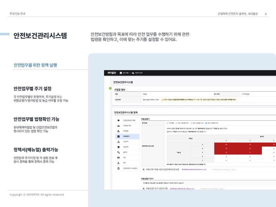 세이플린은 변화하는 규제에 맞춰 안전 업무를 체계화하는 통합 안전관리시스템으로써 안전분야 관련 법규사항들을 고려하여 안전관리체계를 구축하고, 안전관리 활동 지원과 문서 업무 기능을 시스템으로 제공.