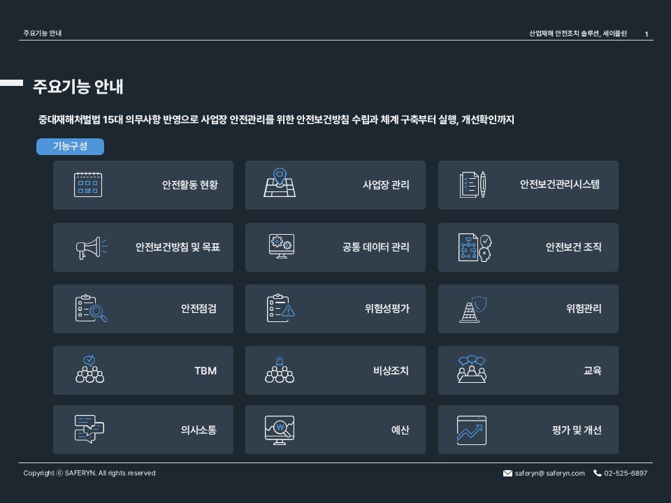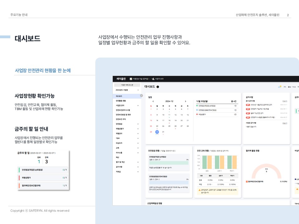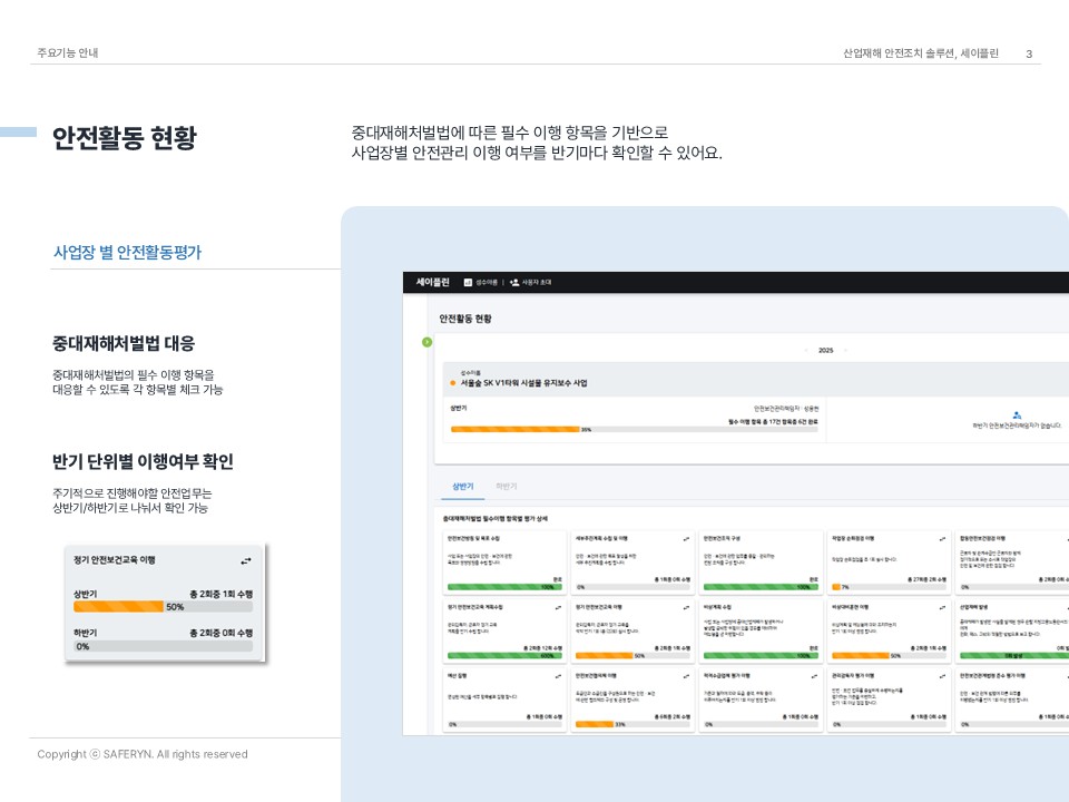 - 대시보드, 안전활동 현황 등: 사업장별 안전보건 활동 데이터를 실시간으로 수집·시각화하여 본사 차원의 통합 모니터링이 가능.