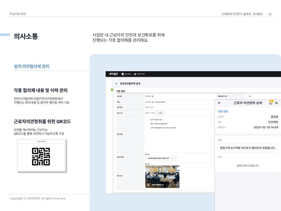 - 의사소통: 사업장 내에서 진행되는 각종 협의체의 공지, 회의록 등 소통 활동을 이행한 기록과 내용 공유.
