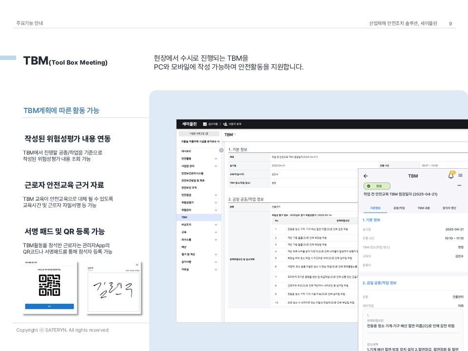 - TBM: 투입근로자를 대상으로 작업 전 팀 단위로 실시되는 위험요소 사전 공유 활동을 전자적으로 기록·관리.