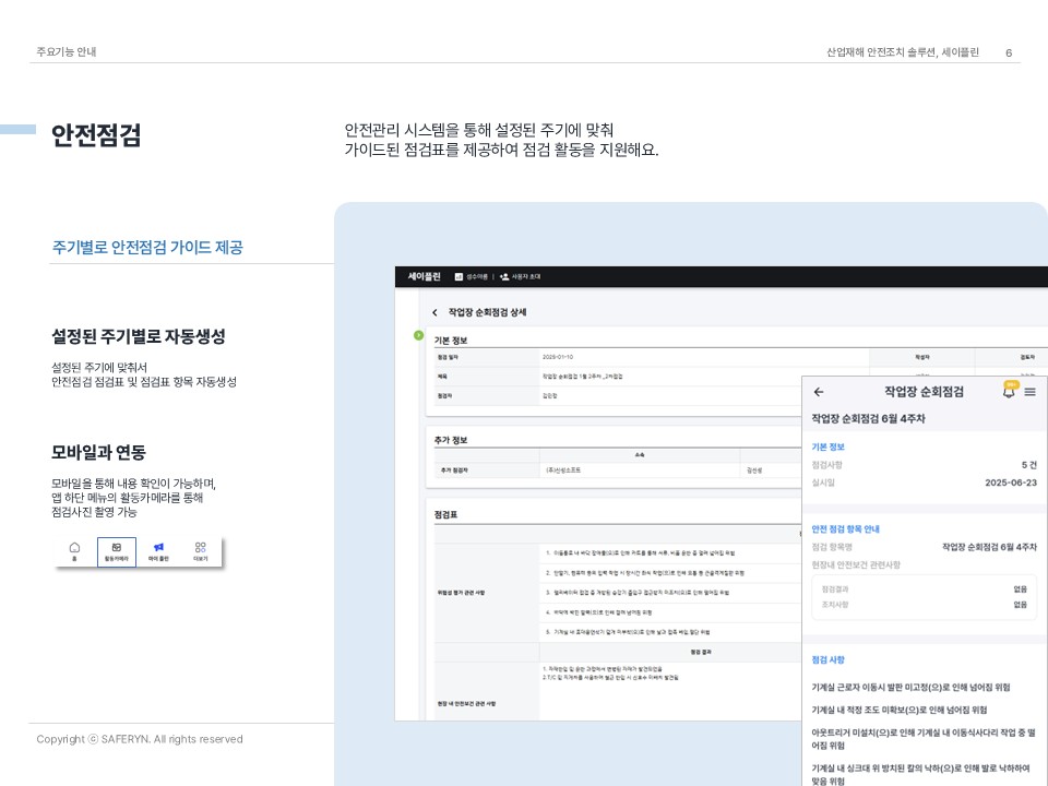 안전컨설팅 전문가의 검토와 다양한 현장의 목소리(VOC)를 반영하여 실제 작업 흐름에 최적화된 기능을 구현하였으며, 현장의 실질적 어려움을 해결할 수 있도록 지속적으로 개선되고 있음.