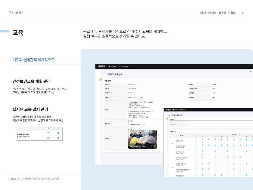 - 교육: 법정/수시 교육 계획 수립, 이수 관리, 교육자료 등록 등 근로자 대상 교육이력을 통합 관리.