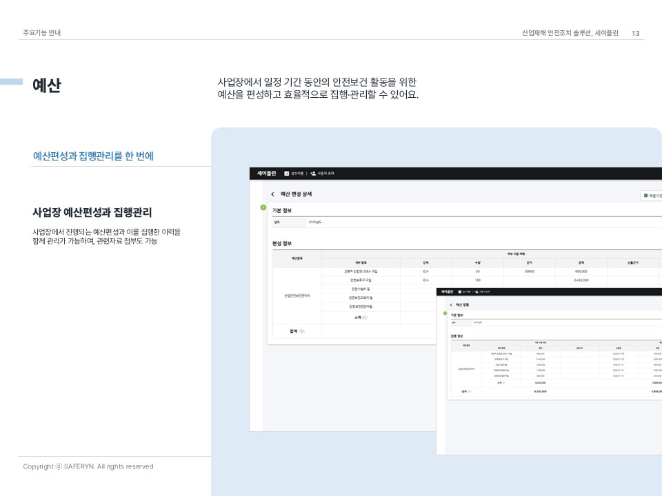 - 예산: 안전보건활동에 투입되는 예산을 항목별로 계획·배정하고 사용 내역을 모니터링.