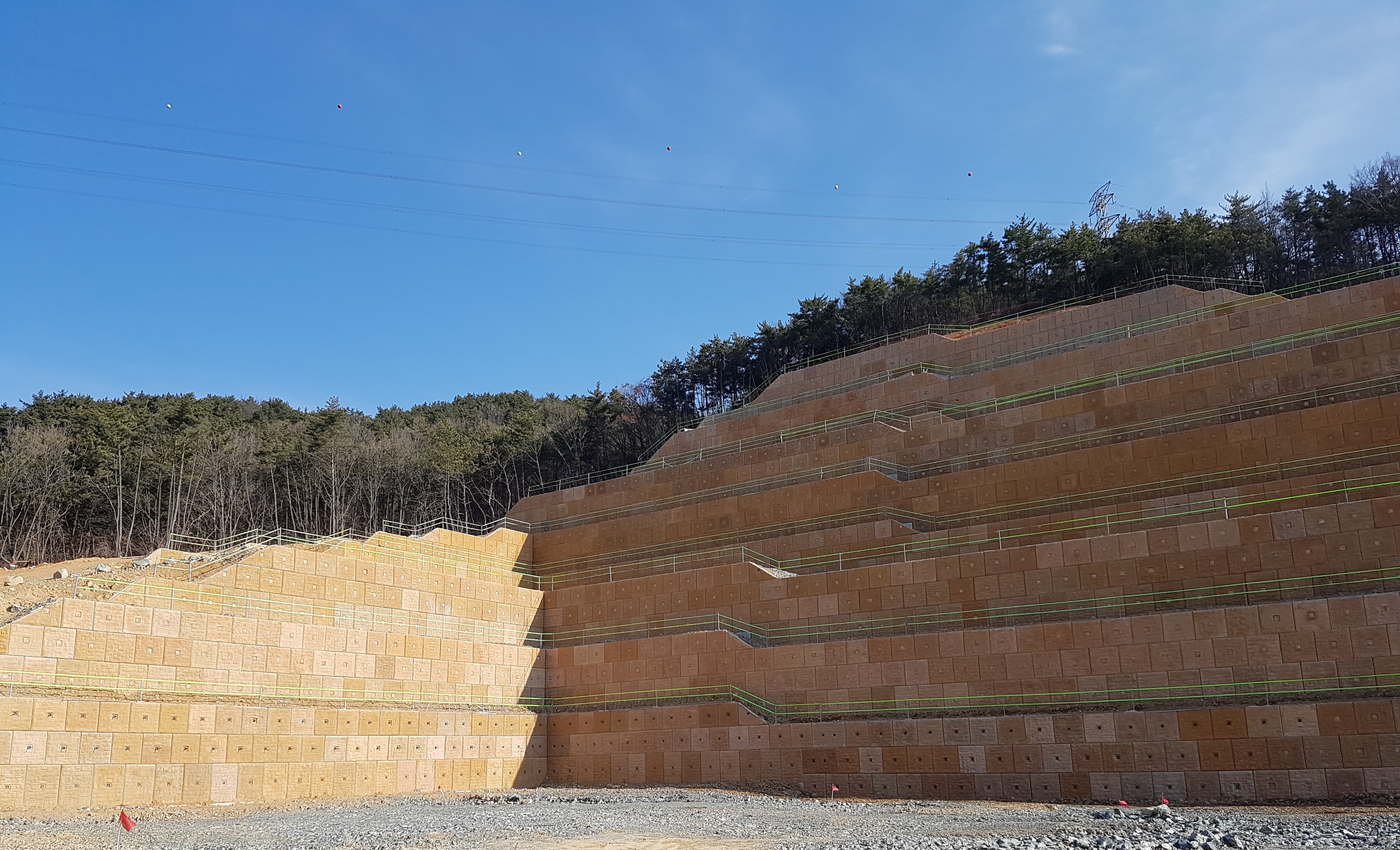 천연석 질감의 색채와 문양의 패널을 사용하므로 미관이 수려하고 주변경관과 조화가 우수하고 원지반에 네일을 삽입하고 지반조건에 따라 중력식 또는 압력