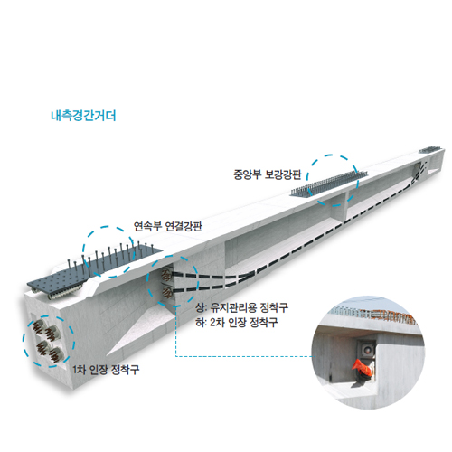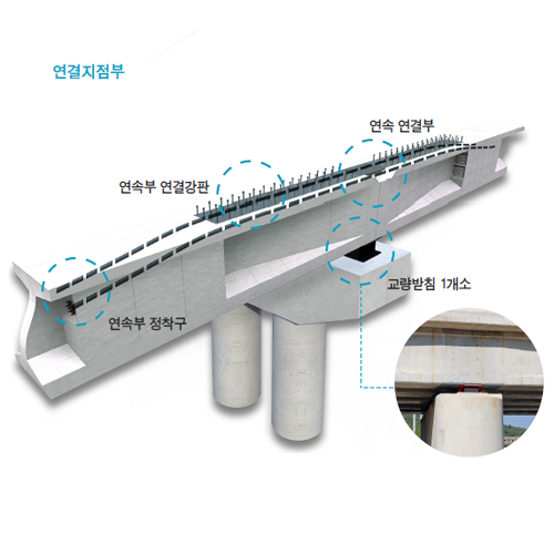 PS긴장재 등의 구성으로 거더를 완전 일체화 시킴으로 시공단계별 긴장력을 도입하는 거더 완전 강결 연속화 공법이며 연속지점부 강결 연속으로 교량받침 개소 감소, 형하고 확보 용이, 거더내에 유지관리쉬스관 매설로 유지관리 용이가 있지만. 2차 강선 긴장 작업이 고소작업임으로 위험요소 존재함