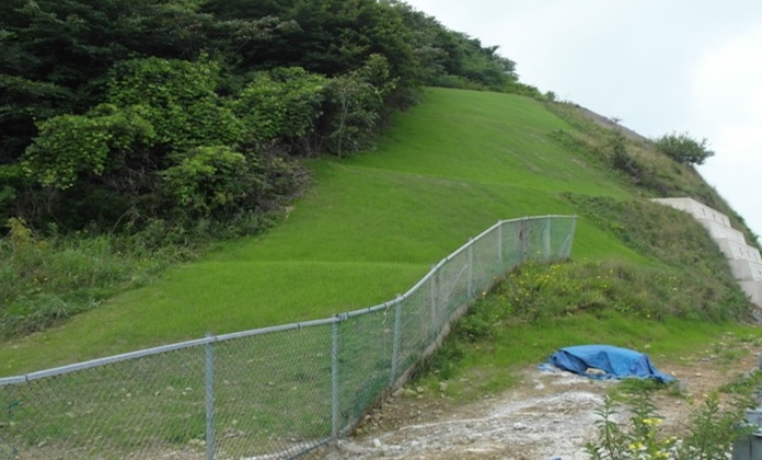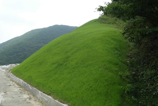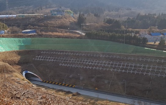 사면에서 터파기후 표층개량재를 탑 다운(TOP DOWN) 방식으로 포설하고 굴삭기(Backhoe)에 의한 Nailing 보강으로 지지력을 향상시킨 지중식 사면보호 옹벽공법
