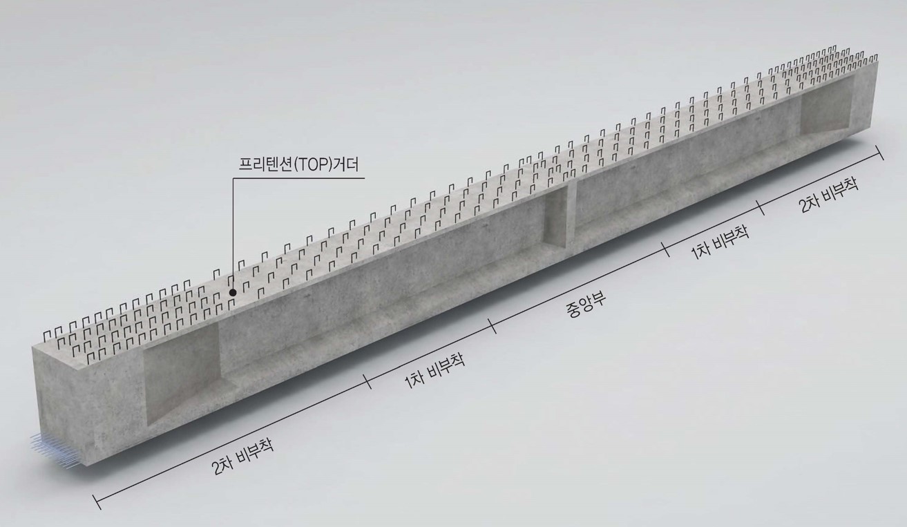 중앙부 단면은 최적이며 이동식 프리텐션 제작대으로 반복사용 가능, 적재 운반 및 조립의 용이성 고려한 시스템, 높은 긴장력에 대해 안정적으로 지지할수있는 시스템